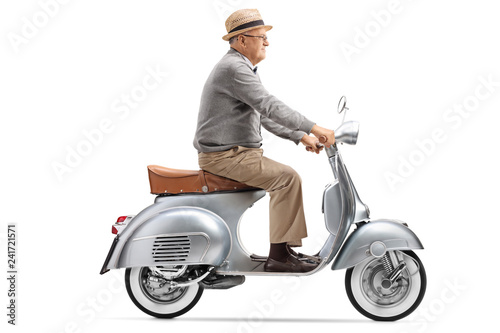 Obraz premium Starszy dżentelmen jedzie na zabytkowym skuterze