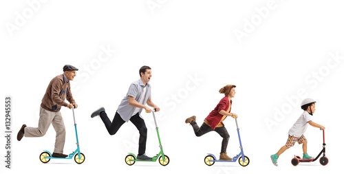 © Ljupco Smokovski, Obraz premium Starszy, mężczyzna, młody mężczyzna i dziecko jeżdżące na skuterach