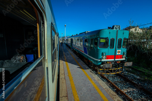 Naklejka premium Starszy włoski pociąg podmiejski czeka na peronie, czekając, aż przejedzie...