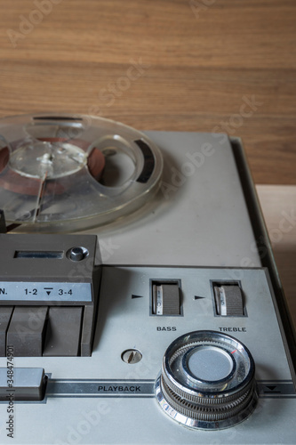 Fototapeta premium start of old tape recorder, play, pause, rewind, man playing