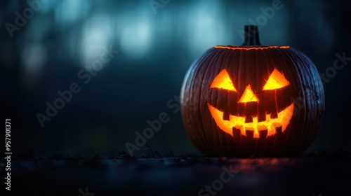 © Arthur Constantine, Fototapeta premium Startled Jack-o'-Lantern with Deep Scars Glowing in Ultra HD - Halloween Decoration Closeup with Copy Space