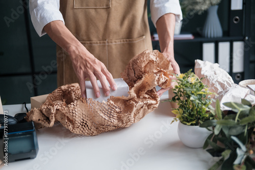 © mojo_cp, Obraz premium startup entrepreneur packs online order in recyclable cardboard box for eco-conscious customer