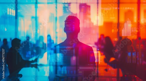 © tanapat, Fototapeta premium Startup founder pitching to investors, close up, entrepreneurial theme, vibrant, Double exposure, conference room