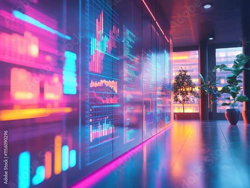 © Nawarit, Fototapeta premium Startup pitch presentation with augmented reality charts and floating holograms, sleek office setting, neon accents, high-tech corporate feel, digital focus