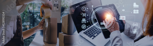 Fototapeta premium Startup small business entrepreneur or freelance Asian woman using a laptop with box, Young success Asian woman with her hand lift up, online marketing packaging box and delivery, SME concept.