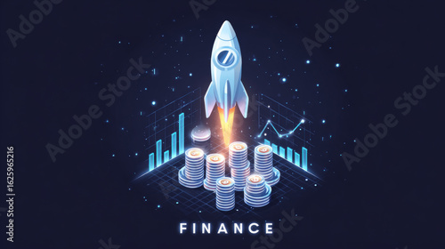 © Maximusdn, Obraz premium startup success theme, rocket labeled Finance launching from stacked coins, graphs trailing behind, glowing upward