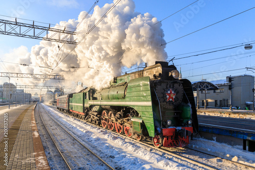 © miklyxa, Obraz premium stary czarny parowóz w Rosji zimą na tle moskiewskiego dworca kolejowego