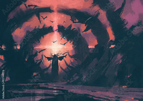 Fototapeta premium Stary czarodziej rzucający zaklęcie w legowisku czarodziejów