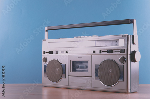 Obraz premium Stary retro blaster magnetofon kasetowy na stole w tle