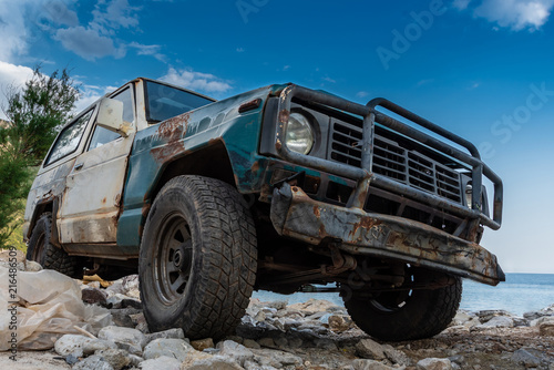 Fototapeta premium Stary, wytrzymały pojazd terenowy utknął w skalistym terenie