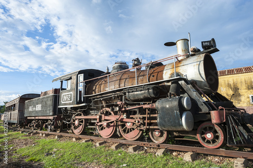 Naklejka premium Stary zardzewiały parowóz staromodnej lokomotywy, pierwotnie używanej w przemyśle cukrowniczym, na torach na obrzeżach Trynidadu na Kubie
