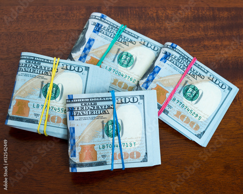Obraz premium Stashes of hundred dollar bills on wooden table