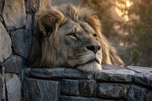 Naklejka premium Stately lion lounging on stone at golden sunset