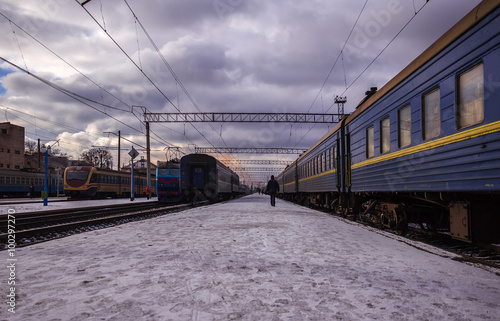 © Lumppini, Fototapeta premium Station at dusk with trains and lonely passers