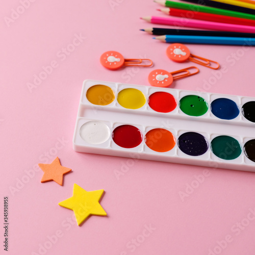© EkaterinaVladimirova, Naklejka premium Stationery colorful writing tools accessories pens pencils, color paper on pink background