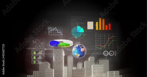 © vectorfusionart, Obraz premium Statistical data processing over 3d city model against grey background