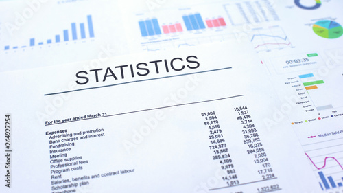 © motortion, Obraz premium Statistics official document lying on table, graphs charts and diagrams, text
