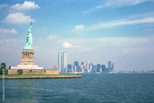 © bennymarty, Fototapeta premium Statua Wolności i bliźniacze wieże, zniszczone 11 września 2001 r. W World Trade Center. Widok na panoramę Nowego Jorku z promu. Symbole NYC, Stany Zjednoczone.