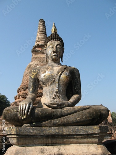 © Pixel Oasis, Fototapeta premium Statue de Bouddha devant un stupa sur le site historique de la ville de Sukothaï en Thaïlande