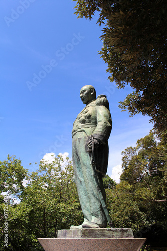 © leodaphne, Naklejka premium Statue of Admiral Togo Heihachiro overlooking sea in Tagayama Park in Kagoshima