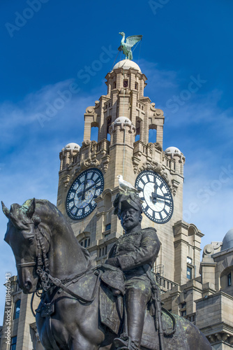 © habari, Fototapeta premium Statue of Edward VII against the Liver Building, Liverpool, Engl
