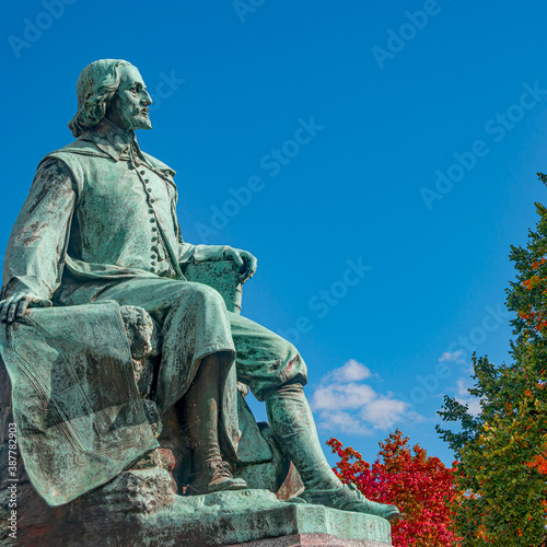 Naklejka premium Statue of great scientist Otto von Guericke in red and golden Autumn colors in historical downtown of Magdeburg Germany, at sunny day and blue sky, closeup, details..