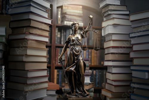 © Nida, Fototapeta premium Statue of Justice among tall stacked books, soft lighting highlights intricate details