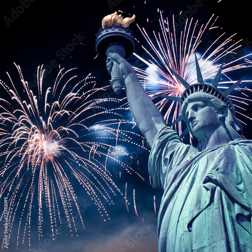 © Delphotostock, Fototapeta premium Statue of Liberty at night with fireworks, New York, USA