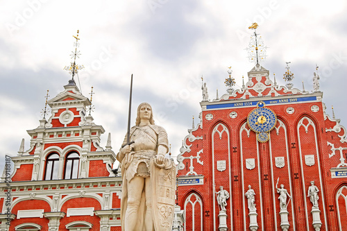 Obraz premium Statue of Roland, favorite nephew of Charlemagne and representative of freedom and justice in front of the guild house of the Blackheads. Riga, Latvia