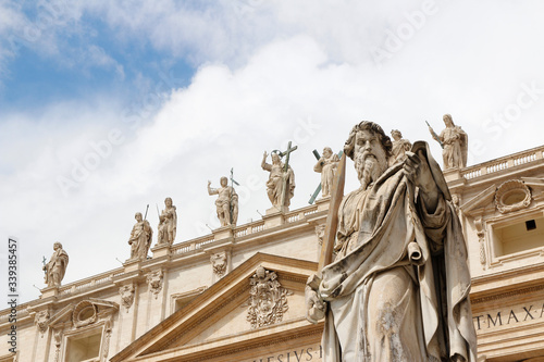 © Crystaltmc, Fototapeta premium Statue of St. Paul with sword in front of St Peter's Basilica with blue sky and clouds in Vatican City, Rome, Italy