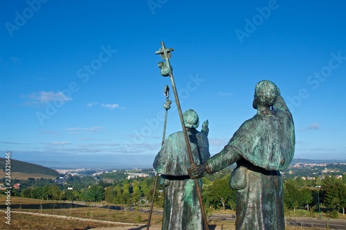 Fototapeta premium Statues of Pilgrims pointing the cathedral on Monte do Gozo in Santiago de...