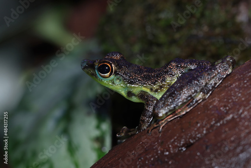 Fototapeta premium Staurois guttatus tree frog closeup on wood, Staurois guttatus frogs closeup