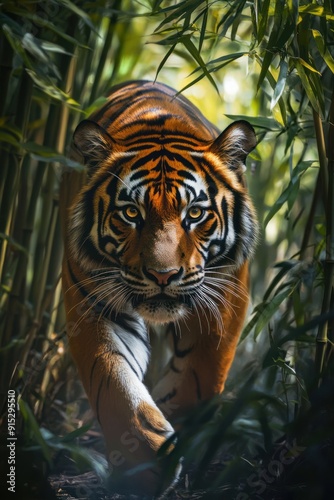 Fototapeta premium Stealthy Tiger in the Jungle - A powerful tiger moves stealthily through dense jungle foliage, its intense gaze focused ahead, embodying strength and grace.
