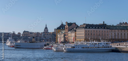 Fototapeta premium Steam and sightseeing boats in the bay Strömmen, the old own Gamla Stan, a sunny spring day in Stockholm