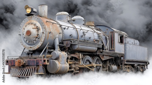 Naklejka premium Steam locomotive emitting smoke and steam in motion on railway tracks