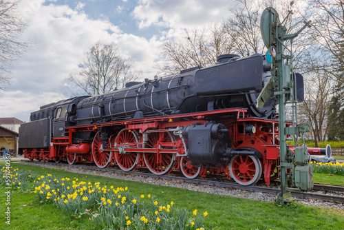 Naklejka premium Steam locomotive in Treuchtlingen. The express locomotive 01 220 as a monument in Treuchtlingen. The locomotive is registered as a monument in the Bavarian monument list.