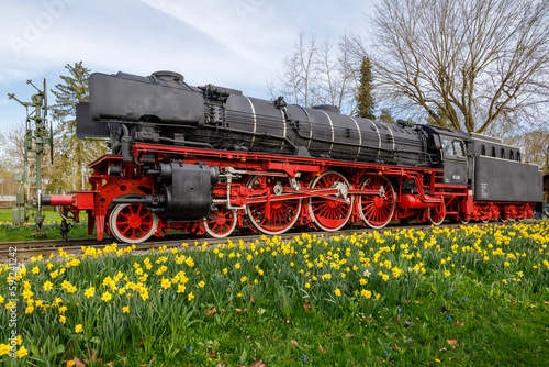 Naklejka premium Steam locomotive in Treuchtlingen. The express locomotive 01 220 as a monument in Treuchtlingen. The locomotive is registered as a monument in the Bavarian monument list.