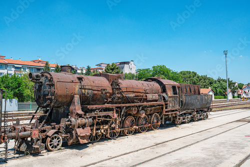 © Selcuk, Naklejka premium Steam locomotive in very bad condition, completely rusty and abandoned on the unused tracks at Uşak Rail way station.
