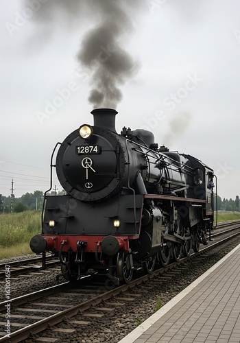 Naklejka premium Steam locomotive on tracks, billowing smoke.