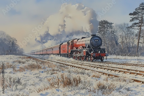 © possawat, Obraz premium Steam Locomotive Passing Through a Winter Forest Scene