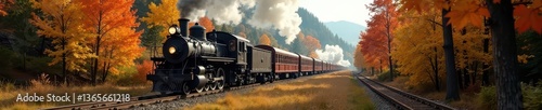 Obraz premium Steam locomotive pulls carriages past vibrant fall colors , scenery, railway,...