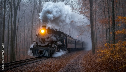 Obraz premium Steam Locomotive Train Emerging from Foggy Forest
