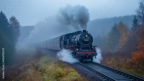 Obraz premium Steam Locomotive Train Traveling Through Foggy Forest