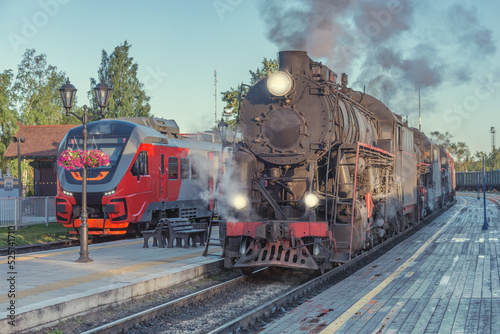 © serjiob74, Fototapeta premium Steam locomotives stand by the wooden platform.