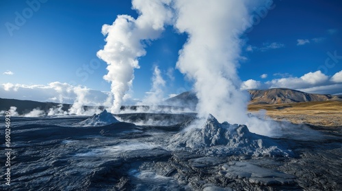 © Adip, Obraz premium Steam rises from geothermal vents in a volcanic landscape.