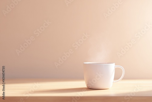 © Maria, Fototapeta premium Steam rises from simple white cup on wooden surface, creating wa