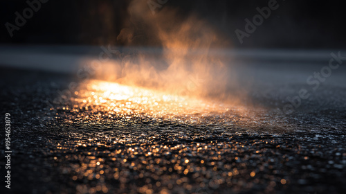 Fototapeta premium Steam rising from hot asphalt road glowing in evening light urban heat effect texture background