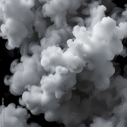 © ADS, Naklejka premium Steam, smoke, vapor isolated on black background. Smoke steam spray, abstract vaporing water, texture of cold mist, hot vapor, fog effect closeup, black screen. Hot food, drink. Overlay using