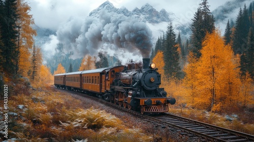 © Ali, Obraz premium Steam train chugs through autumnal mountain forest.