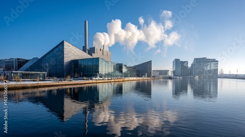 Naklejka premium steam vortices swirling from cooling towers at night, their patterns reflected in black mirror-like waters, illuminated by the plant's amber safety lights